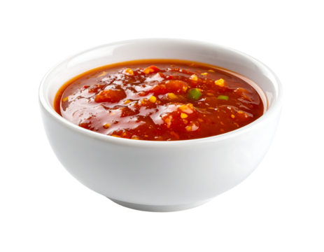 A chunky, vibrant red-orange sauce with visible vegetable pieces, served in a white bowl.