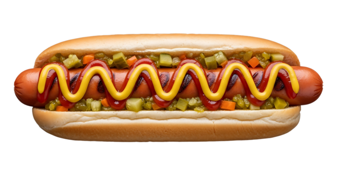 Appetizing close-up of hotdog with condiments and pickle relish on transparent background