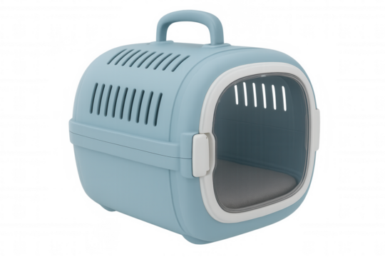 Light blue and white plastic pet carrier with metal grid door, ensuring comfortable and safe transportation for animals
