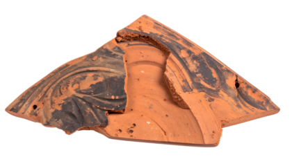 Ancient ceramic fragment with dark patterns. Broken pottery