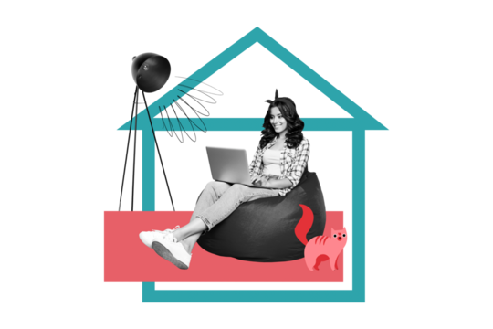 Composite photo collage of happy business girl remote work type laptop distance occupation sit home kitten isolated on painted background