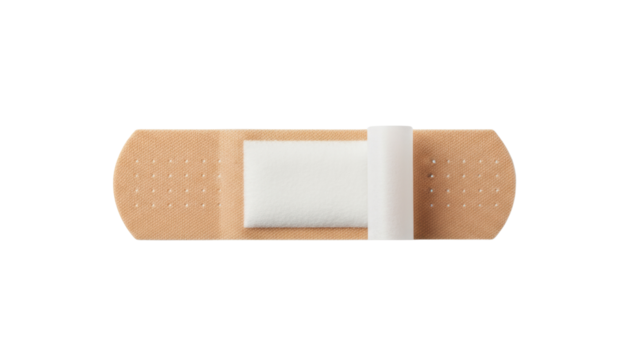 Adhesive bandage with a white absorbent pad and a brown protective backing placed flat against a white background object on white
