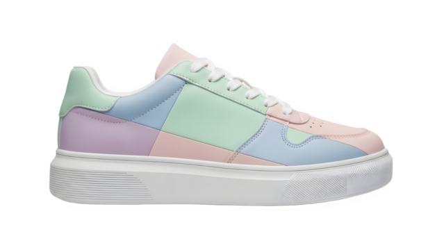 Stylish pastel multi-color sneaker in pink blue and green shades, background removed PNG file for creative shoe design layouts.
