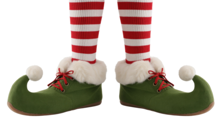 Christmas elf legs wearing traditional red and white striped socks and pointed green shoes with fur trim and pom-poms. background removed