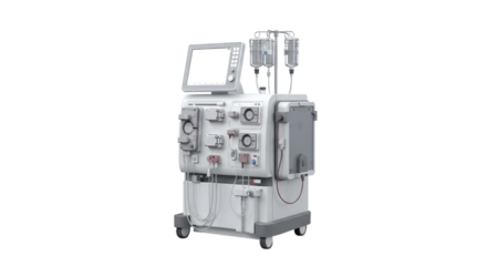 Dialysis Machine on Transparent Background Medical Equipment Featuring Digital Interface Fluid Bags and Multiple Connection Points in a Clean Isolated Render