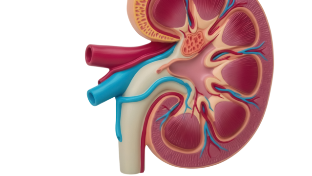 Human kidney cross section isolated PNG, detailed anatomical model showing renal cortex, medulla, and blood vessels on transparent background