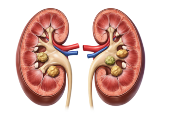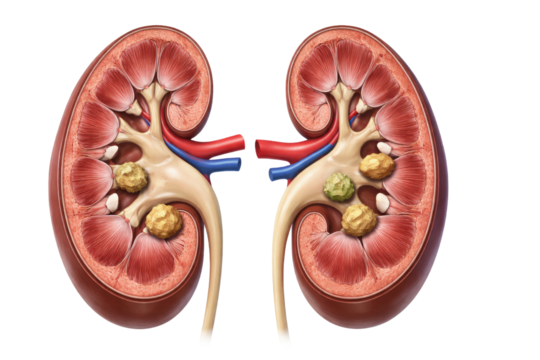 Human kidney anatomy illustration showing renal stones cross section pathology nephrology medical education isolated on white background