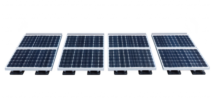 Array of five solar panels installed outdoors on a sunny day, renewable energy technology for sustainable power generation isolated on transparent background