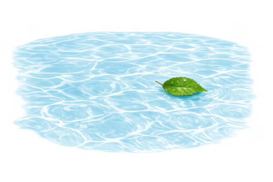 Green leaf floating on clear blue water with ripples, symbolizing freshness, nature, purity, and renewal on transparent background