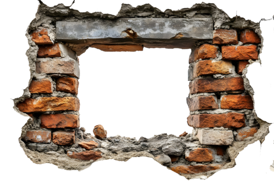 Weathered brick wall section with a broken opening, showcasing rustic textures and colors for architectural design.