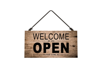 Blue wooden we are open sign hanging with rope isolated on transparent background