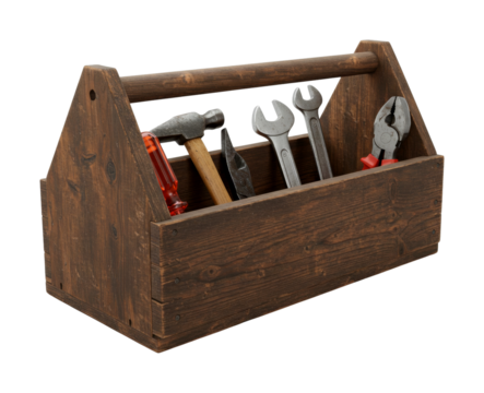 Old wooden toolbox filled with various hand tools, including a hammer, wrenches, and pliers, ready for repair and construction projects.