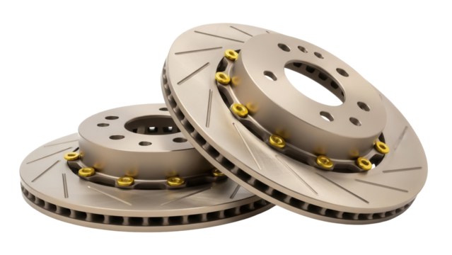 Pair of slotted brake rotors isolated PNG, high-performance car parts for automotive repair and upgrade on transparent background