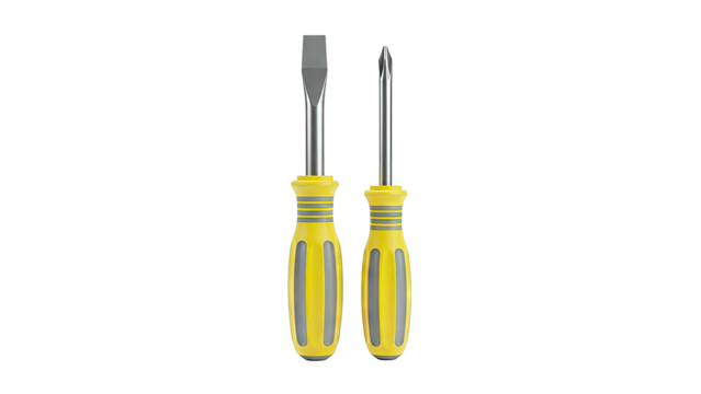 Yellow Phillips head screwdriver isolated PNG on transparent background, hand tool for construction and repair work