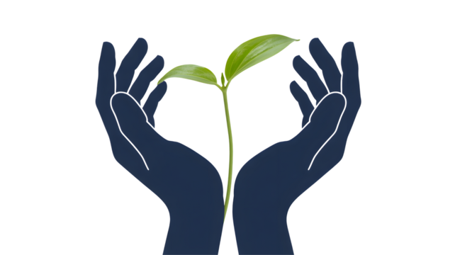 Abstract illustration of a sprout in hands emphasizing growth, care, nurturing, and environmental awareness on a clean white background