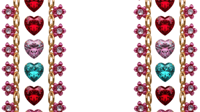 Elegant vertical borders showcasing intertwined golden chains with sparkling heart-shaped gems in various colors and delicate floral embellishments, creating a luxurious and decorative design element
