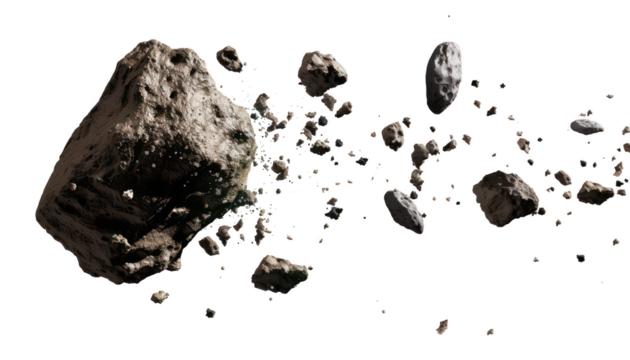Fantastic celestial body with deep craters showing blue and orange surface, transparent background
