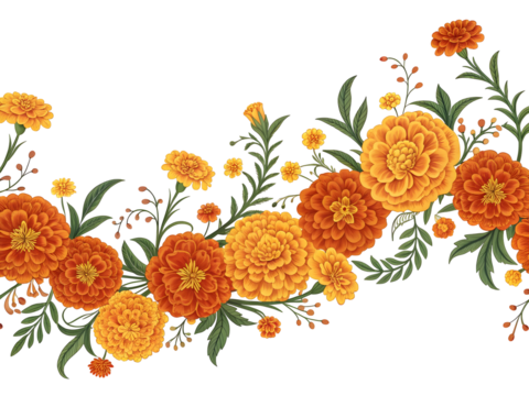 Orange and Yellow Marigold Flower Garland Vector Pattern with Green Leaves, isolated on a transparent background