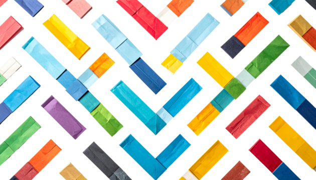 Colorful, repeating V pattern created with wrapped rectangular objects