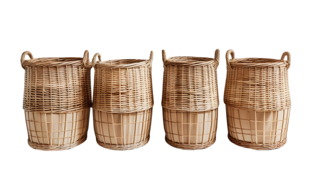Wicker storage baskets with wooden bottom isolated on transparent background, no shadow, evenly spaced for product stock photography png cut out