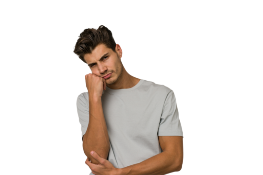 Young handsome caucasian man isolated on white background tired of a repetitive task.