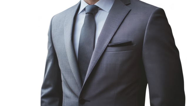 Man dressed in a sharp grey suit and tie, prepared for a formal event or business meeting, exuding confidence