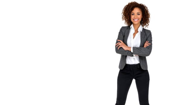Confident businesswoman in a professional suit poses with crossed arms, exuding a sense of authority and competence. Ideal for depicting leadership and success in the workplace.