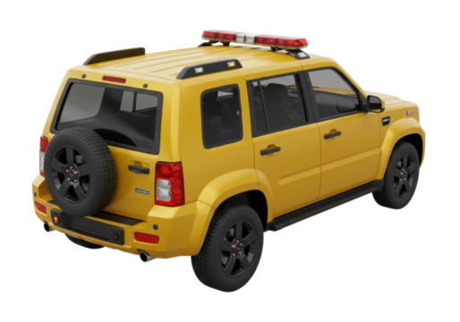 Isolated yellow SUV emergency vehicle with rooftop lights, a 3D rendering, transportation