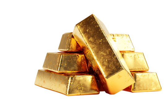 Gold bars stacked in a luxurious display business isolated on transparent background, png