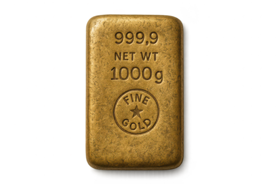 Gold bar 999.9, 1000g on transparent background, bullion of wealth value