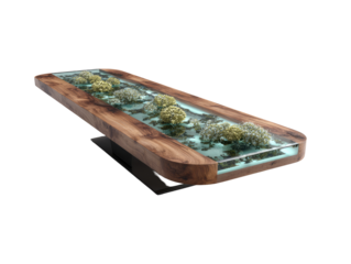Modern, elongated coffee table with a wood top and clear acrylic inlay.  Small plants/flora are displayed within