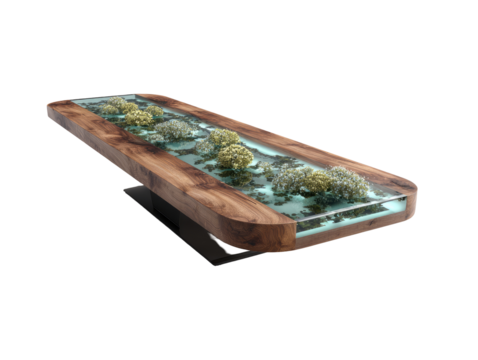 Unique live edge river table with vibrant blue epoxy resin isolated on transparent background
