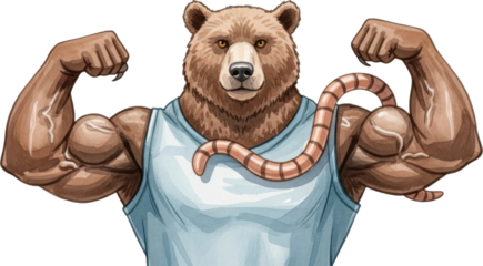 Muscular brown bear flexing with resistance band isolated on transparent background