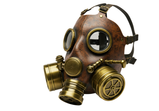 Dark grey gas mask with dual filters. Essential personal protective equipment (PPE) for chemical safety, hazardous gases, dust, and air pollution. Represents concepts of protection, transparent