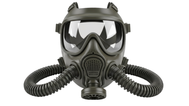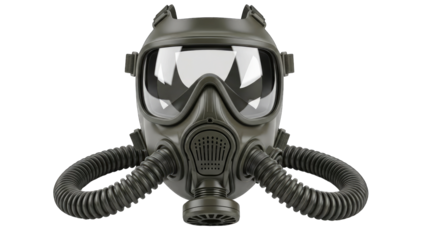 Dark grey gas mask with dual filters. Essential personal protective equipment (PPE) for chemical safety, hazardous gases, dust, and air pollution. Represents concepts of protection, transparent