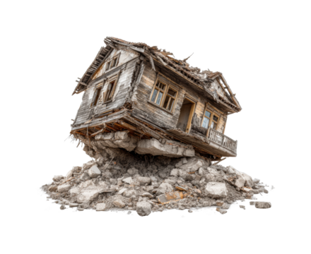 Devastating earthquake destroys old house on rocky ground urban landscape hdr isolated on transparent background, png