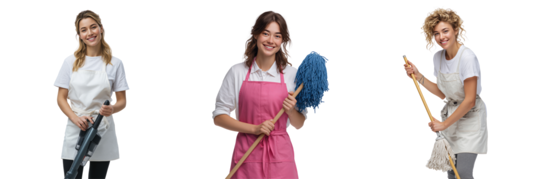 Cleaning action with smiling women transparent background lifestyle environment indoor viewpoint