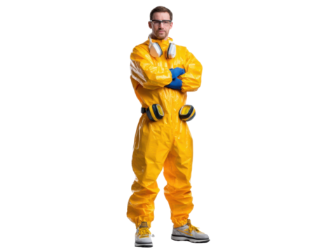 Protective Worker: A professional wearing a yellow protective suit, ear defenders, and safety glasses stands confidently.