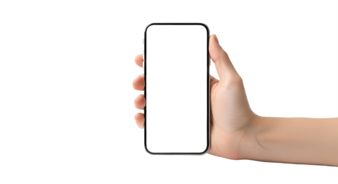 Hand holding phone with blank screen for app demo or responsive design mockup, perfect mobile ads