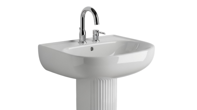Modern pedestal sink with chrome faucet isolated PNG on transparent background, bathroom fixture for interior design and plumbing use