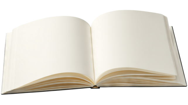 Blank open notebook isolated on transparent background high resolution PNG style clean white pages perfect for digital cutout mockups stationery design layouts and creative planning concepts