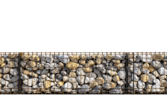 Close-up of stacked stones encased in a metal mesh, forming a gabion wall for landscape construction and architectural design.