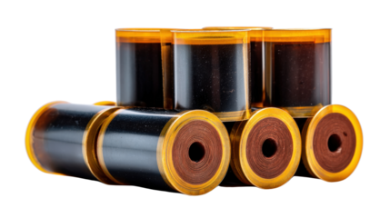 35mm vintage film rolls stacked with depth of field isolated on a Transparent background, PNG file.