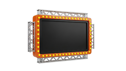 Rectangular orange frame with glowing bulbs surrounding a black void