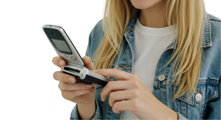 A silver flip phone isolated on transparent background, a classic mobile communication device with a hinged design, blending nostalgia with functionality