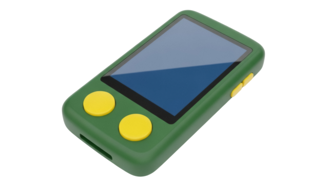 Isolated green handheld game console, yellow buttons, vintage digital device, video games, retro