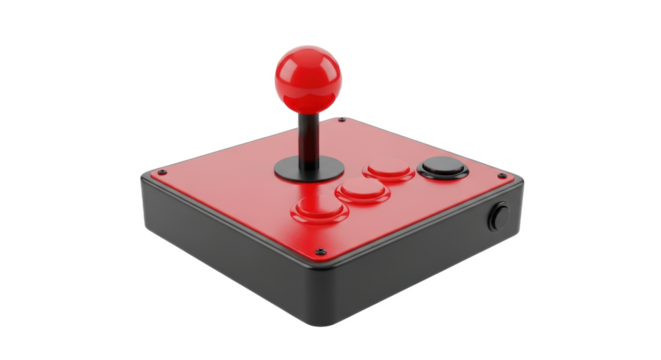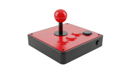 Classic black arcade joystick controller with red ball top isolated on transparent background