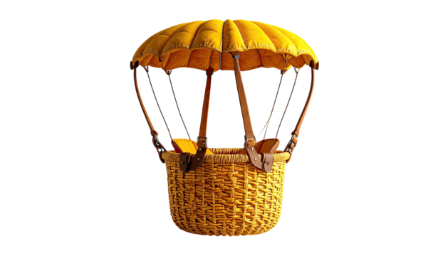 A vibrant yellow hot air balloon with a woven basket against a stark black background