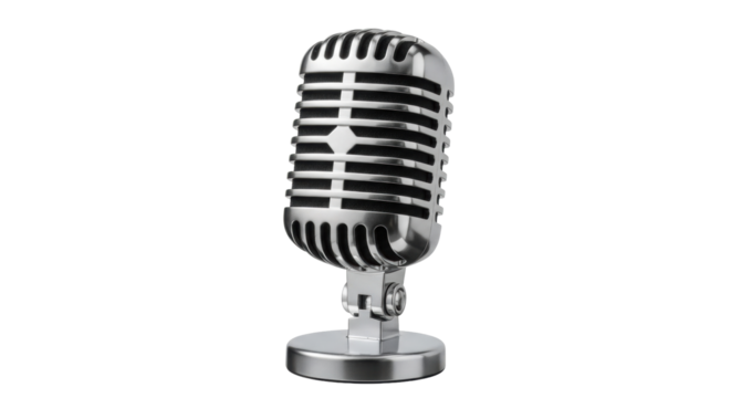 a classic, chrome-plated microphone with a shiny, reflective surface. The microphone has a retro design and is mounted on a stand, ready for use. no background png