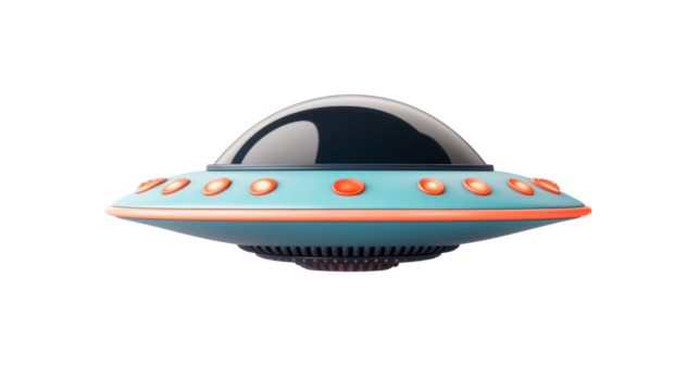 Retro cartoon flying saucer, vintage alien spaceship, cut out transparent